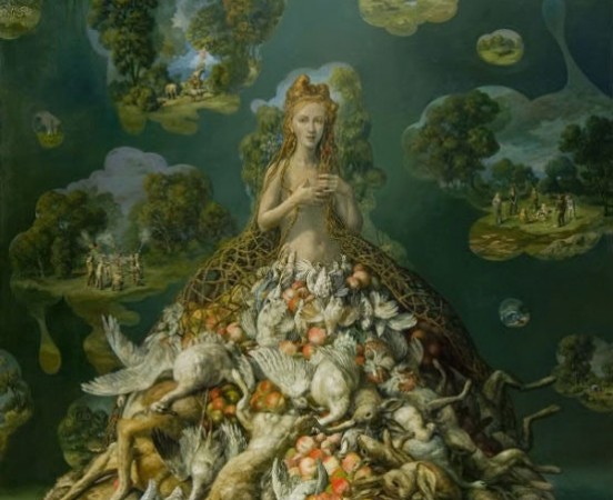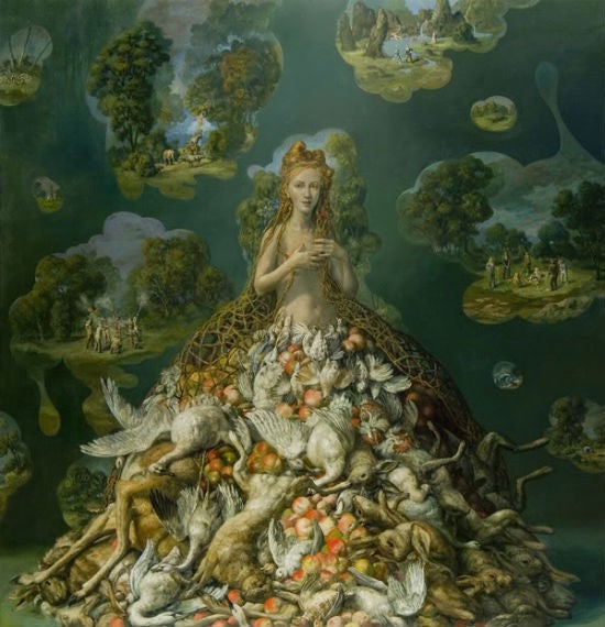 줄리 헤퍼넌의 캔버스 오일 작품은 정교한 디테일과 우화적 색조로 피터 브뤼겔 과 히에로니무스 보쉬를 떠올리게 합니다 . 풍부한 색소와 사실적으로 표현된 그녀의 이미지는 환상적입니다. 분화구가 있는 유성, 잘린 작은 머리, 덩굴에 얽힌 나무, 반짝이는 하얀 이빨을 가진 생물이 결합되어 상상의 우주론을 삽화로 표현한 것처럼 보이는 기괴한 세계를 만들어냅니다. 뉴저지주 몬트클레어 주립 대학의 미술 교수인 헤퍼넌은 전국의 박물관에 그림을 소장하고 있으며 도쿄에서 파리, 칼라마주에 이르기까지 모든 곳에서 작품을 전시했습니다.